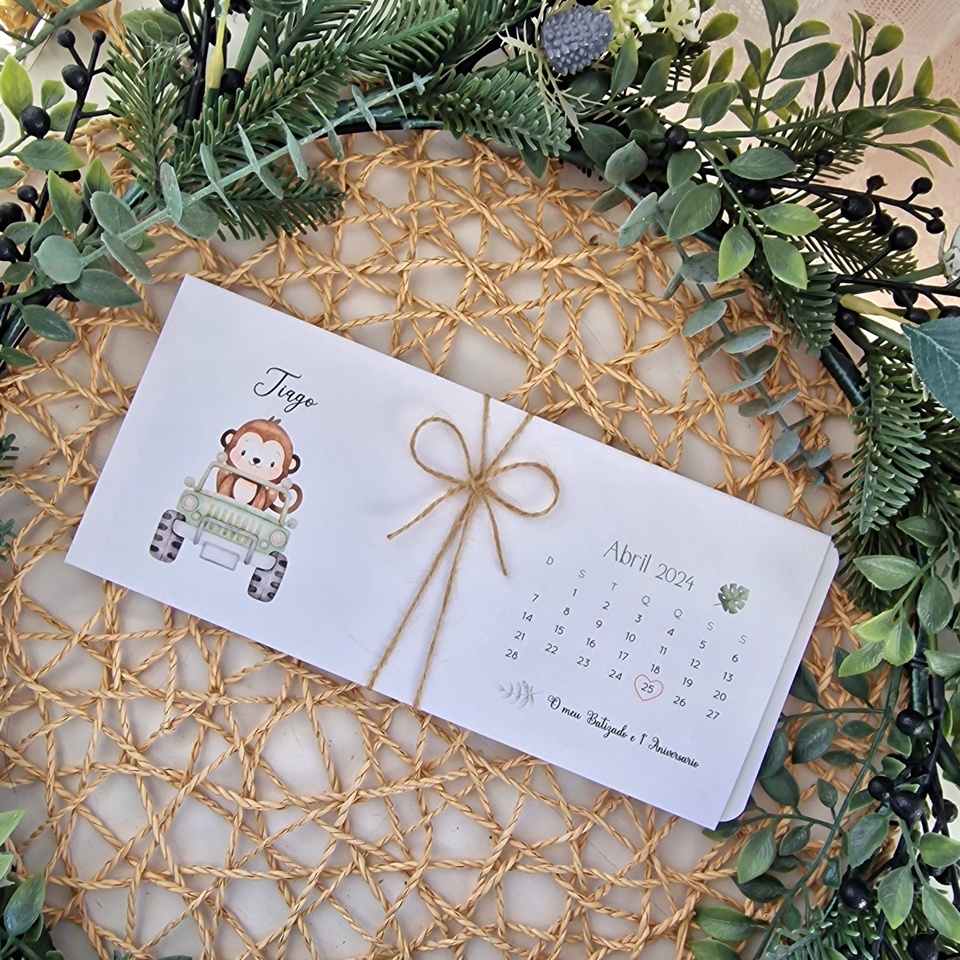 Convite de batizado personalizado bilhete de embarque para a selva do macaquinho tipo envelope com interior deslizante