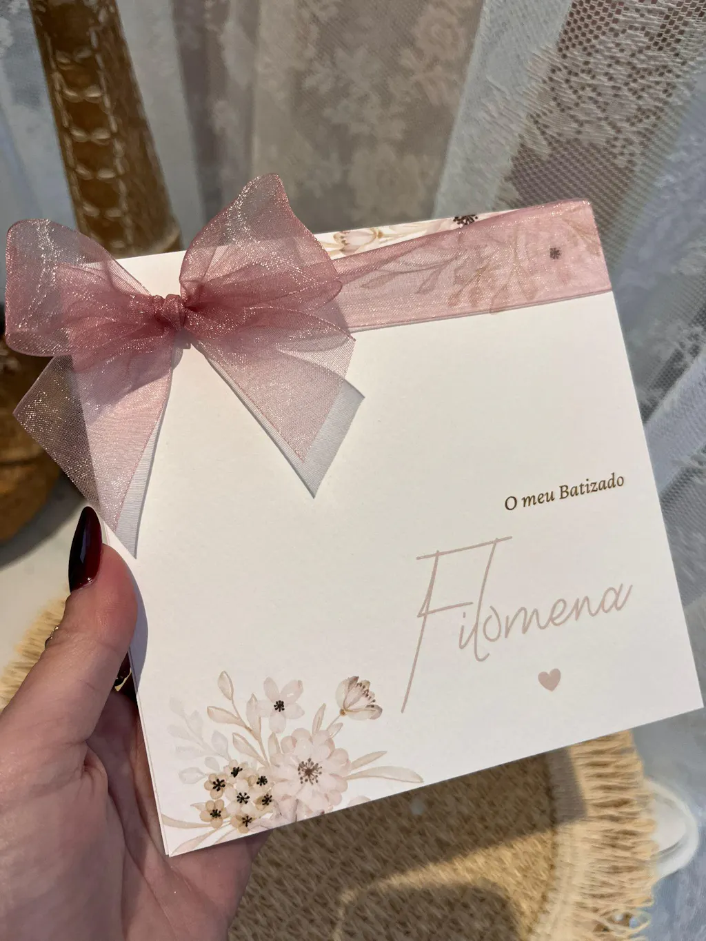 Convite de batizado quadrado, em papel texturado branco 240gr, finalizado com fita em organza premium — uma escolha delicada e cheia de significado para um dia tão especial