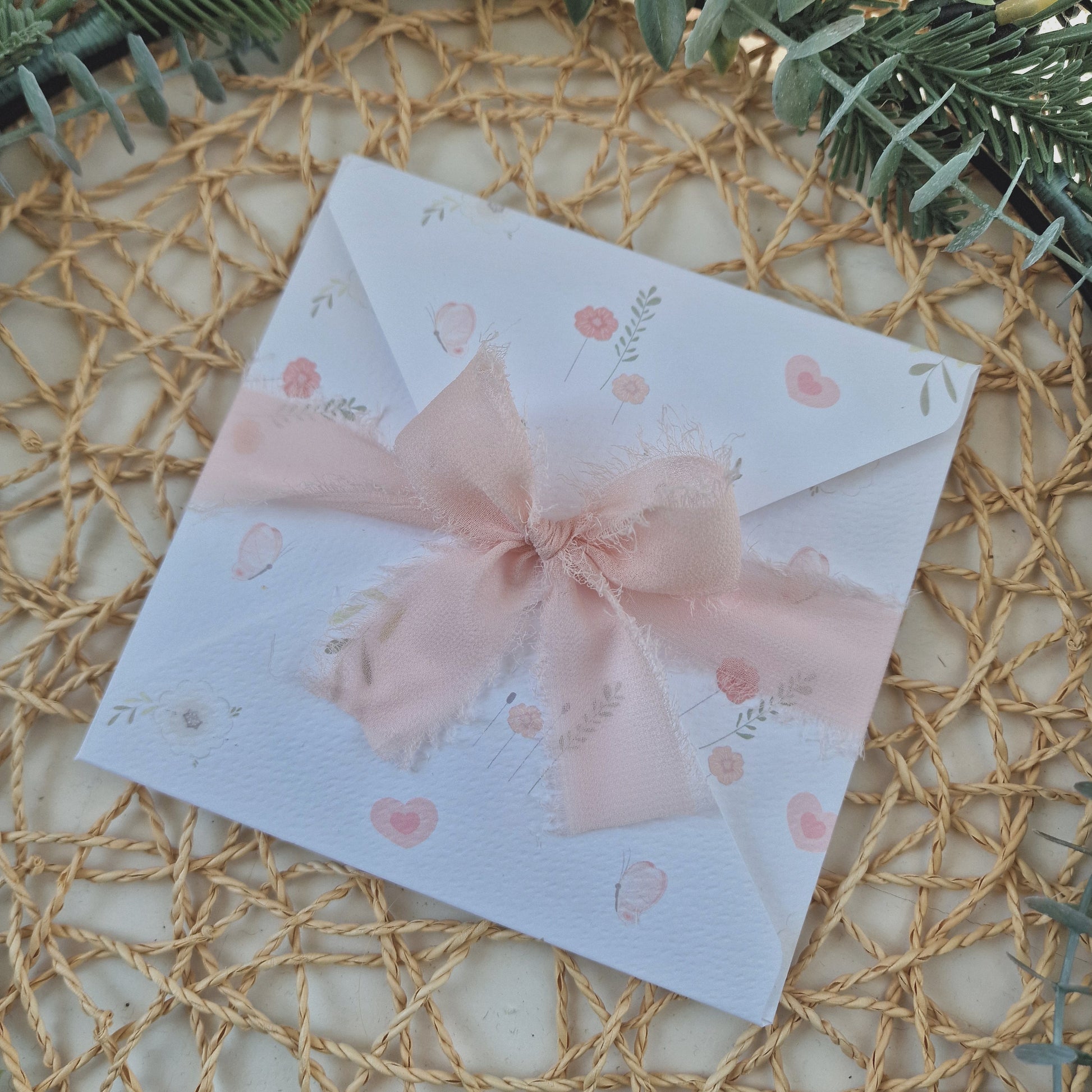 Convite quadrado com padrao floral no exterior