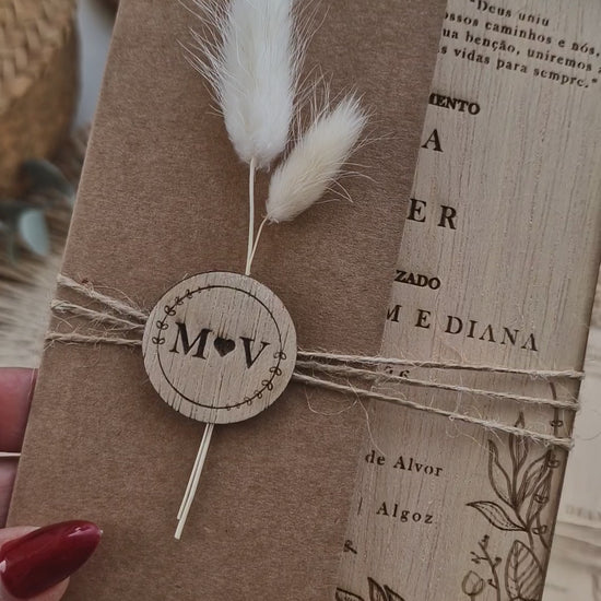 Exterior em papel kraft 275gr. Com flores secas pompons e monograma gravado em madeira