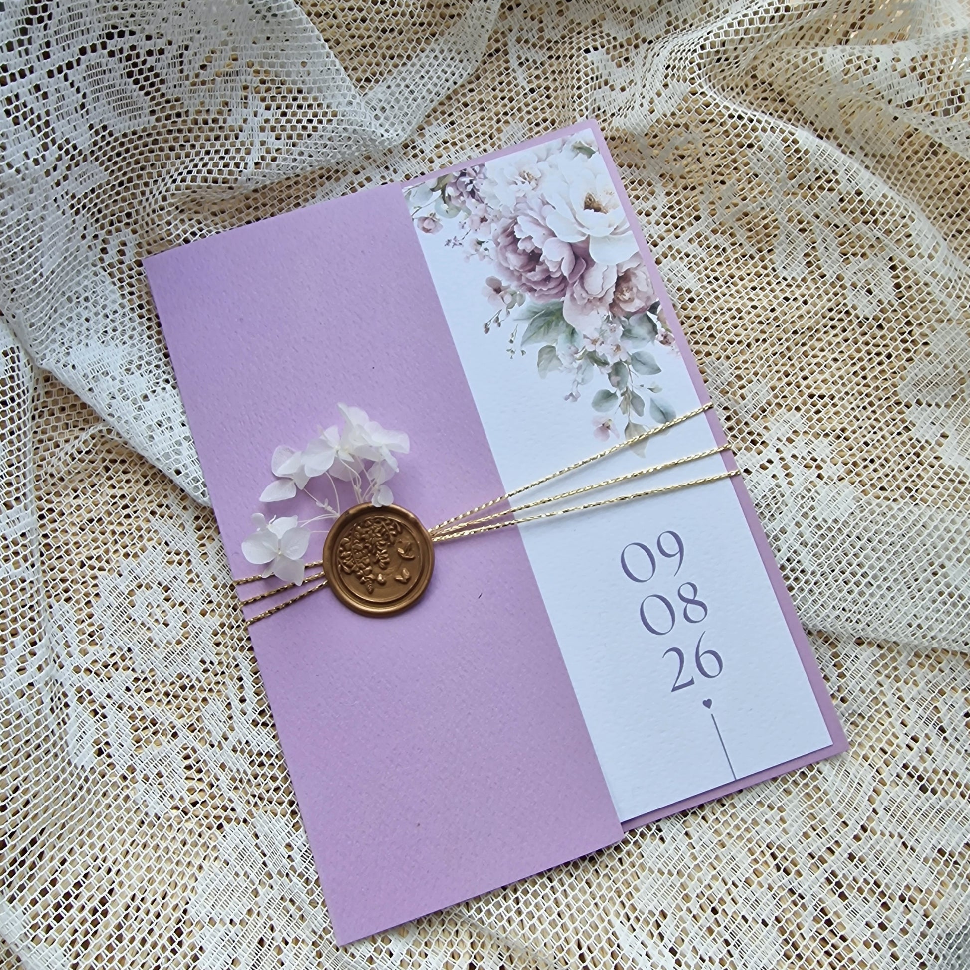Convite de casamento lilás com floral lavanda muito românttico com fio dourado e lacre branco ♡ hortenses brancas desidratadas