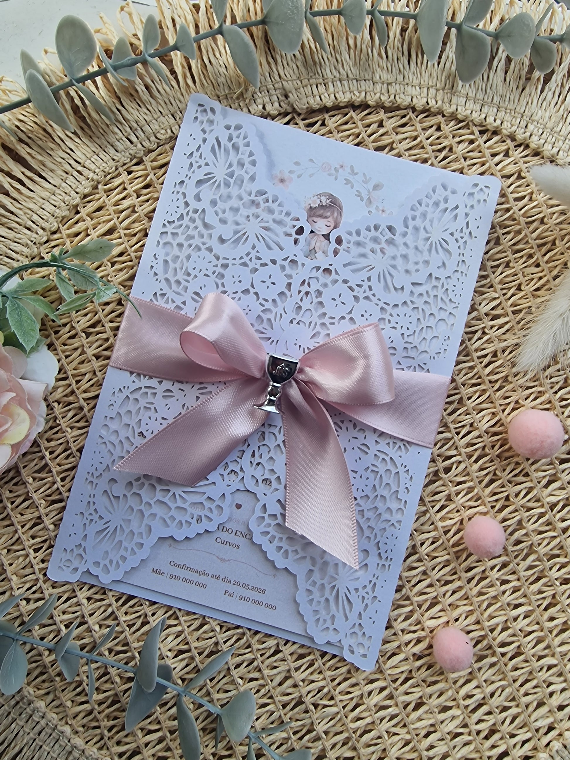 Convite de 1ª Comunhão com papel rendado cortado a laser personalizado com tons rosa, lacinho em acetinado rosinha