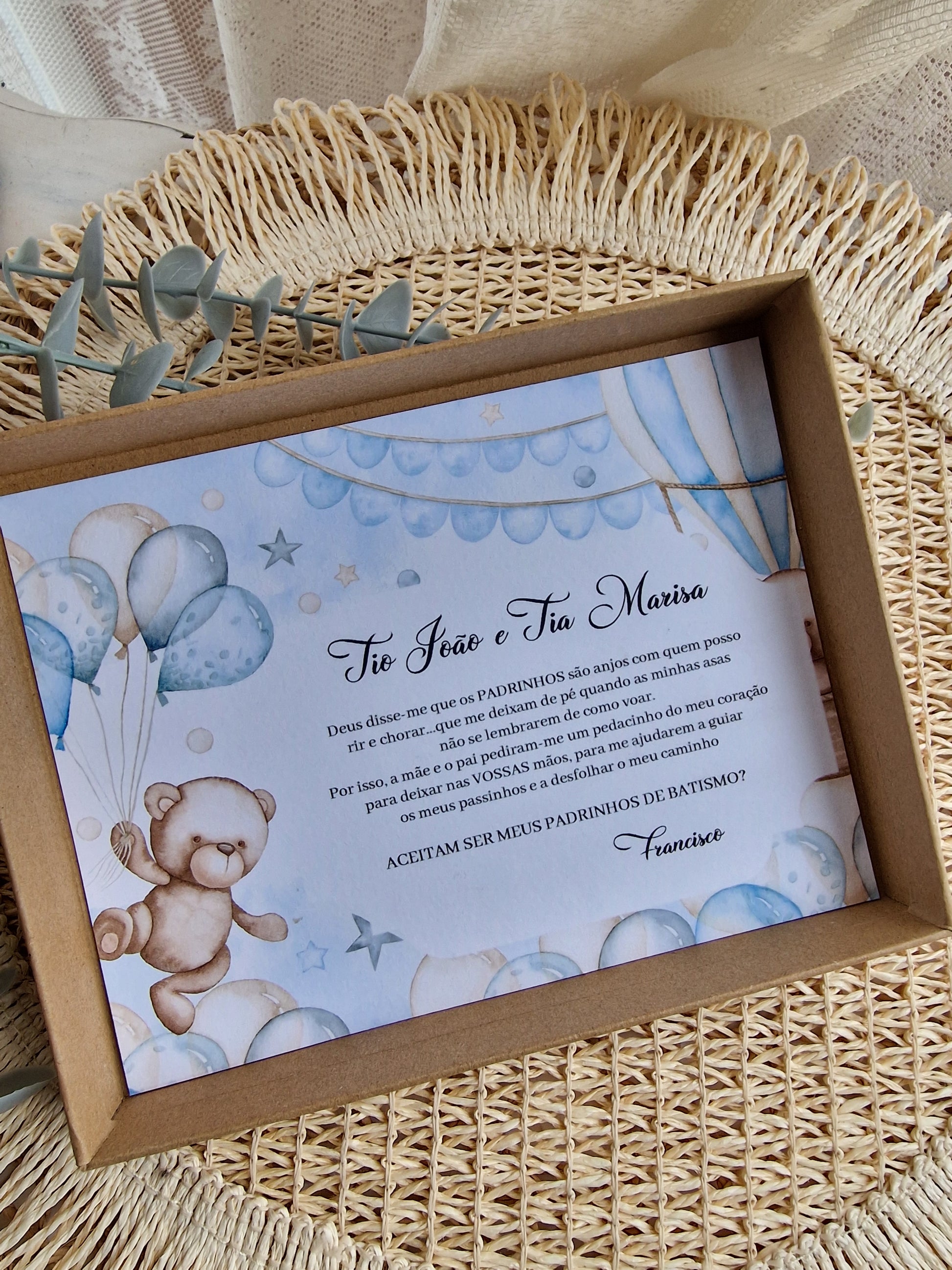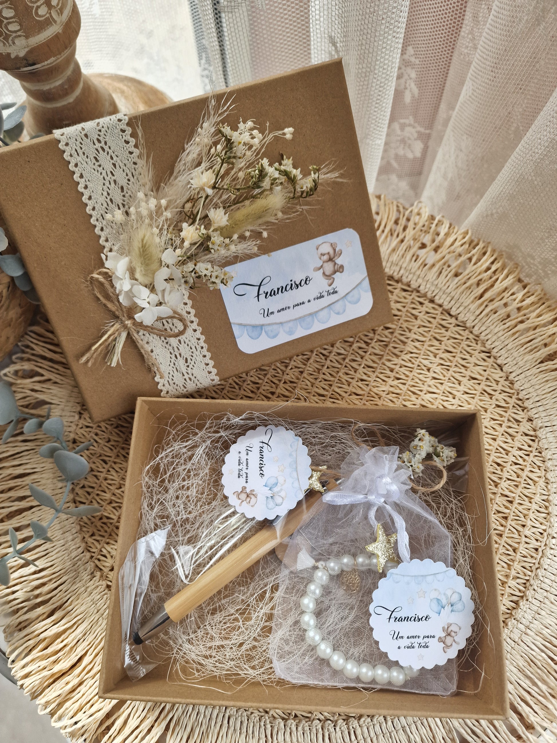 Caixa para Casal de Padrinhos inclui caneta e pulseira.