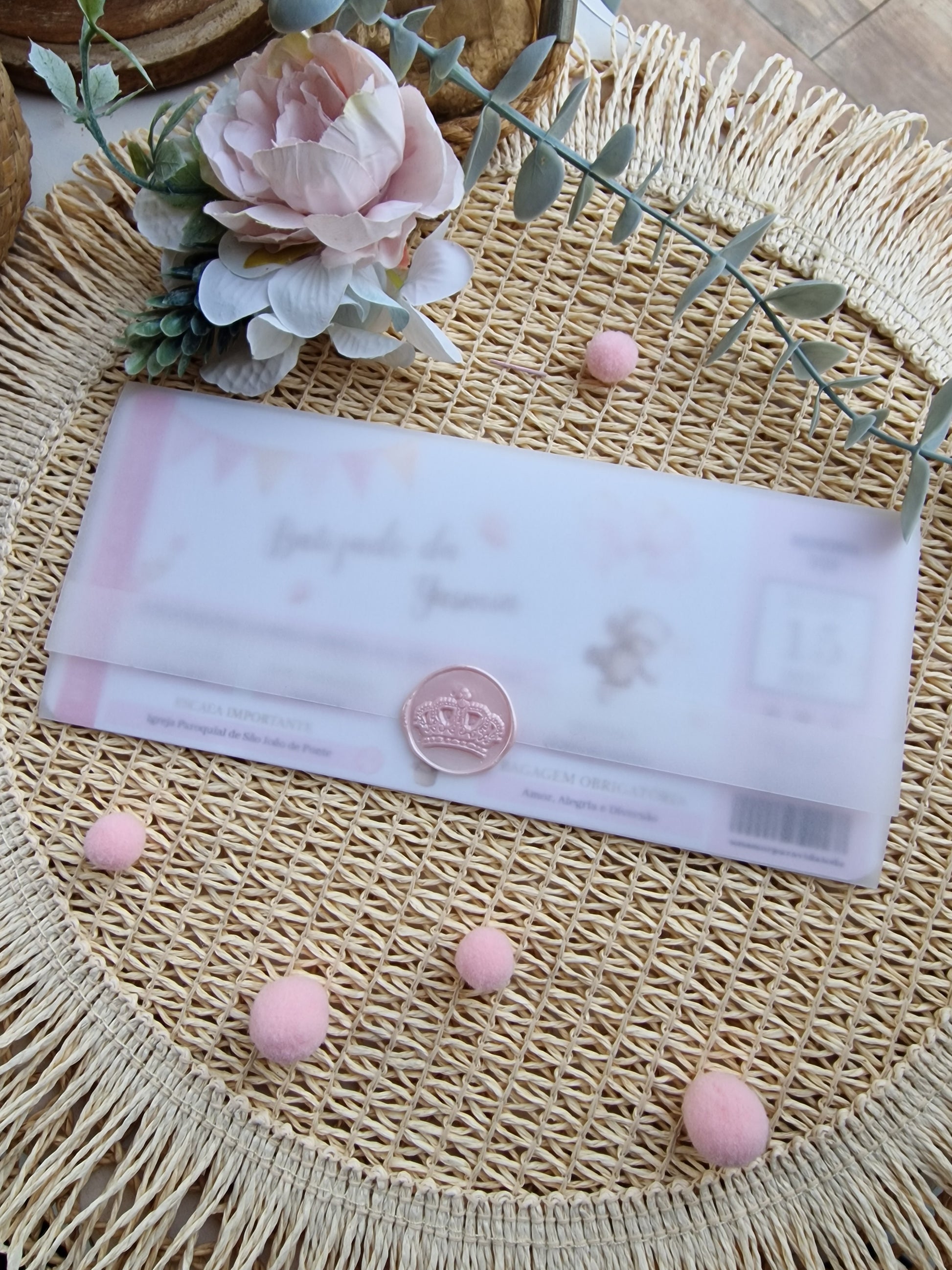 Convite de batizado bilhete de embraque da Yasmin com capinha transparencia e lacre cora rosa