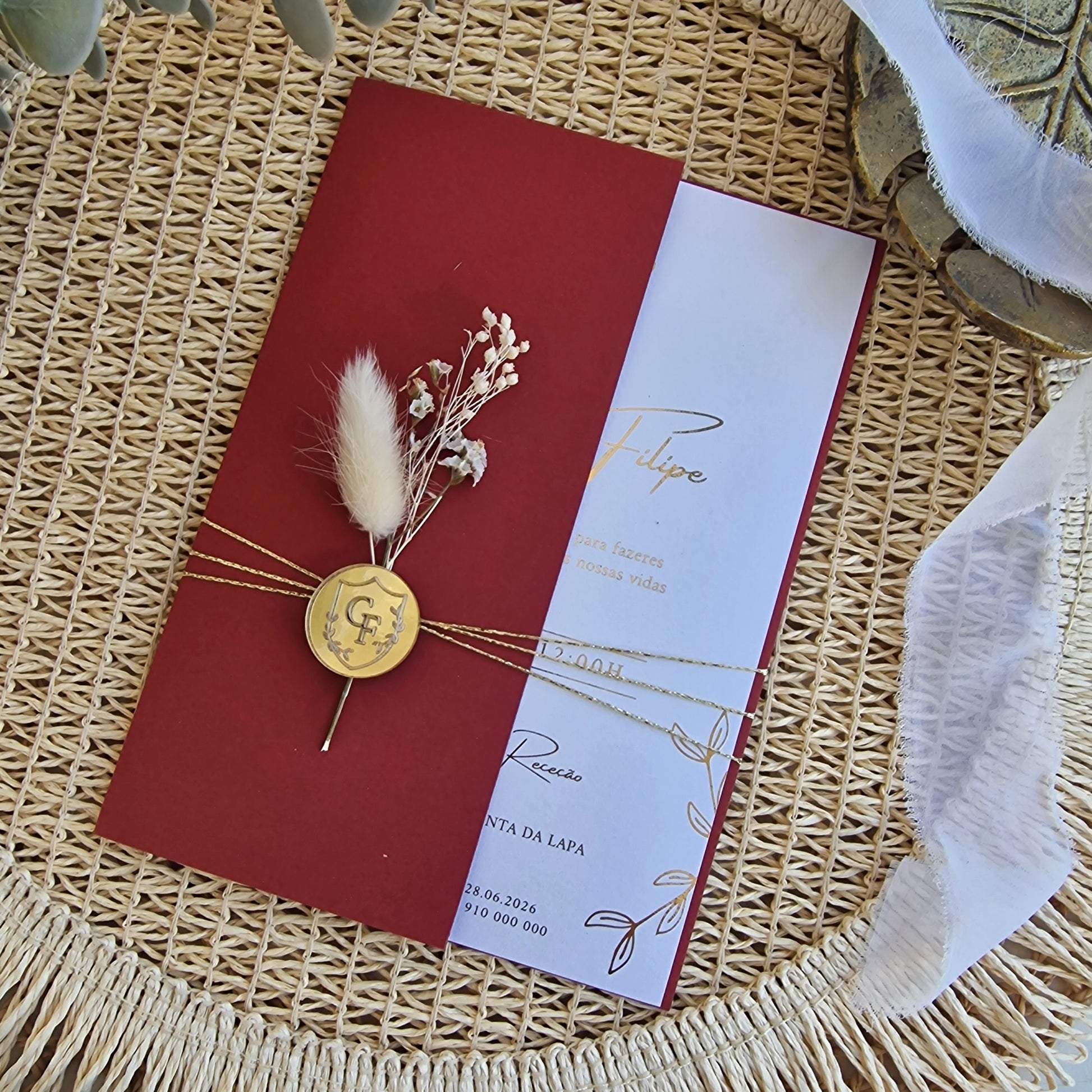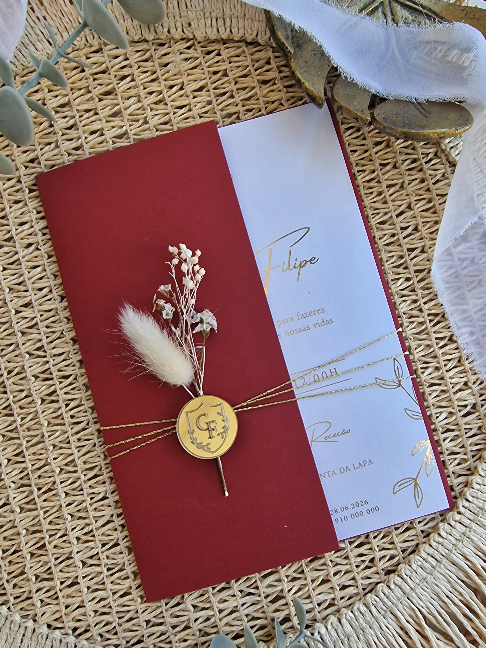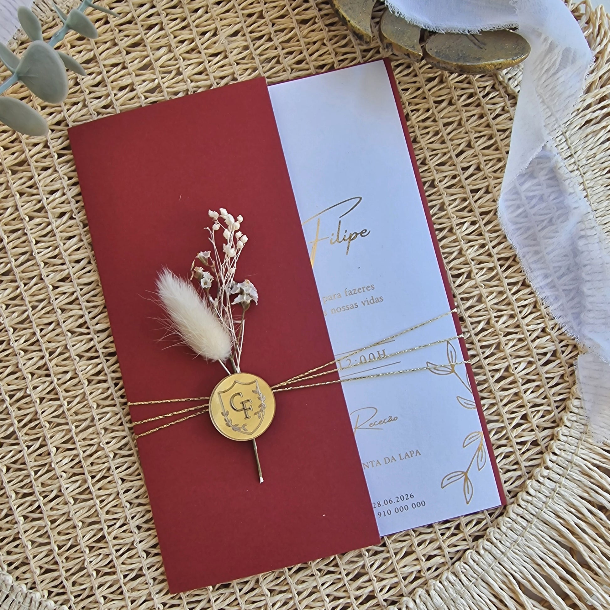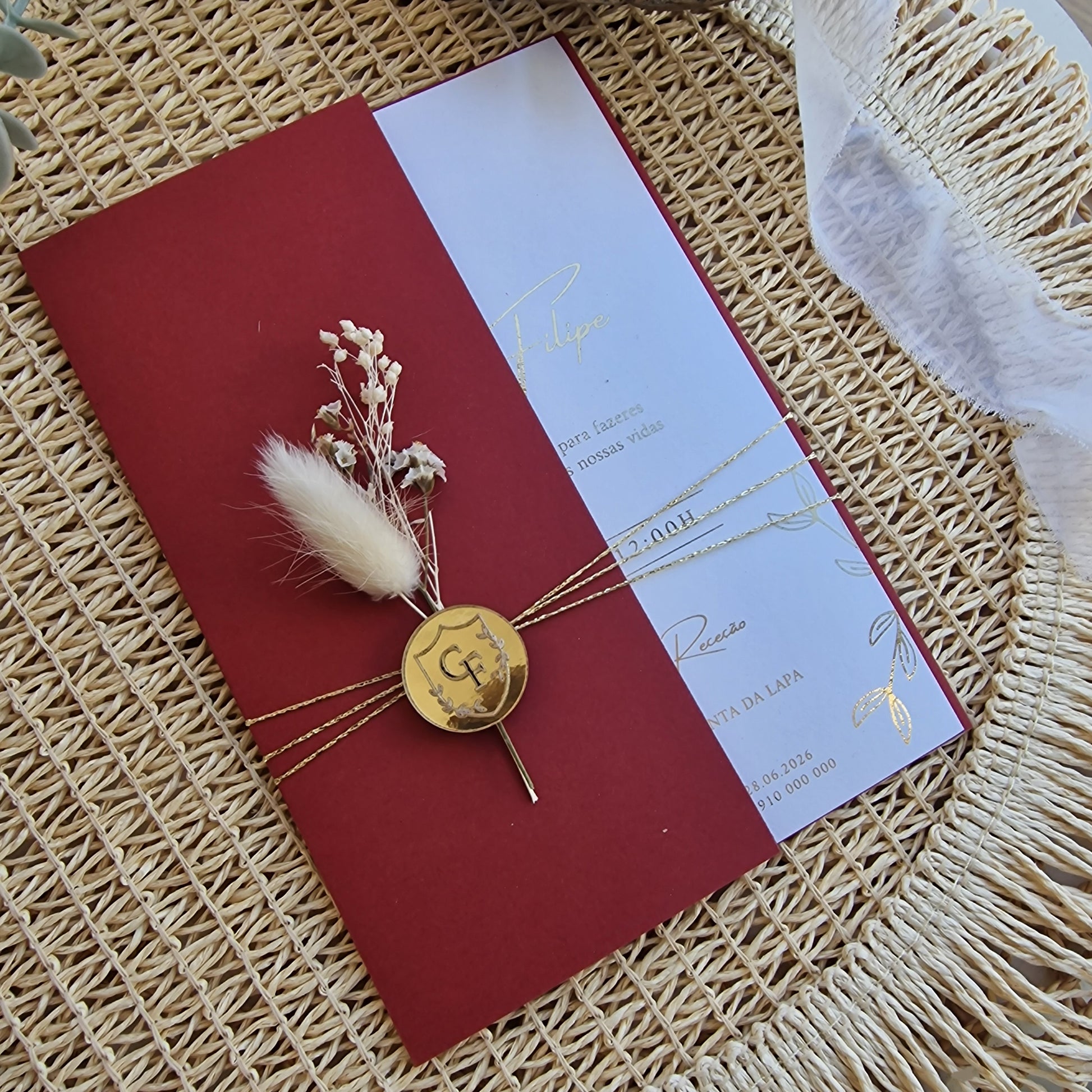 Convite bourdeaux e com fio dourado monograma espelhado, flores secas e foil dourado