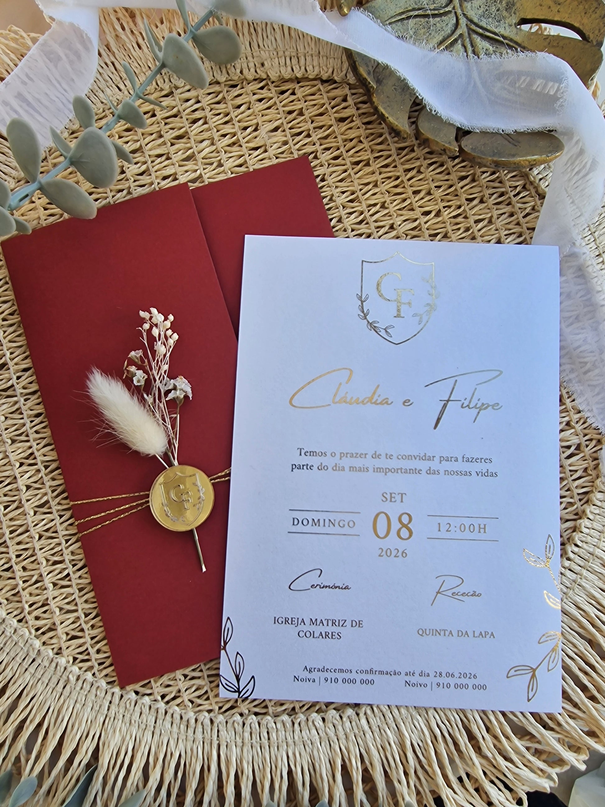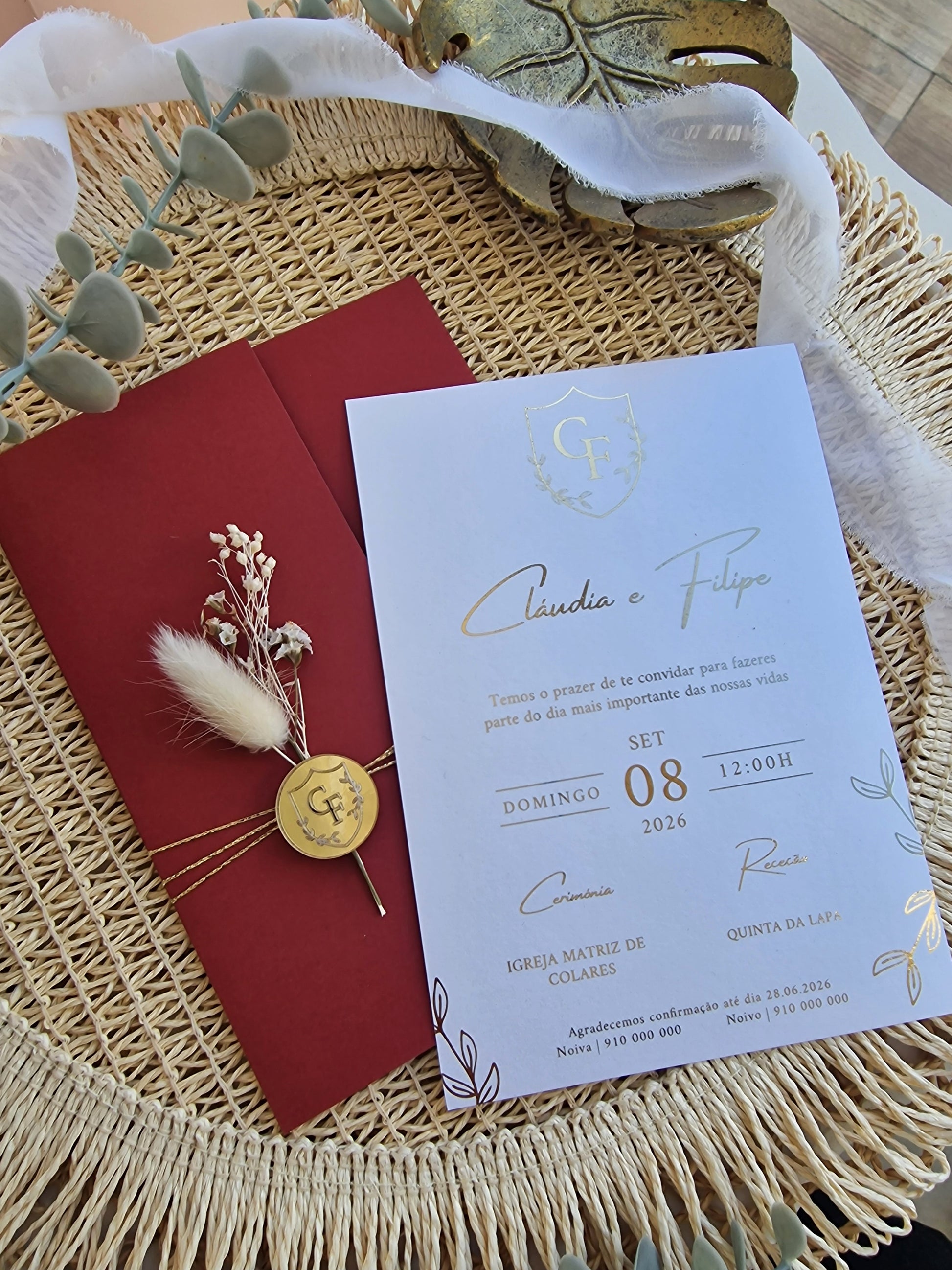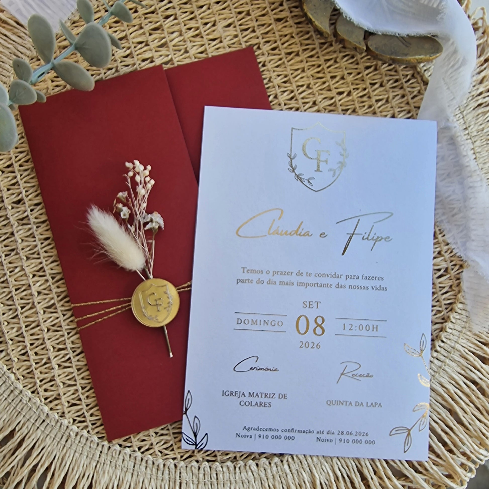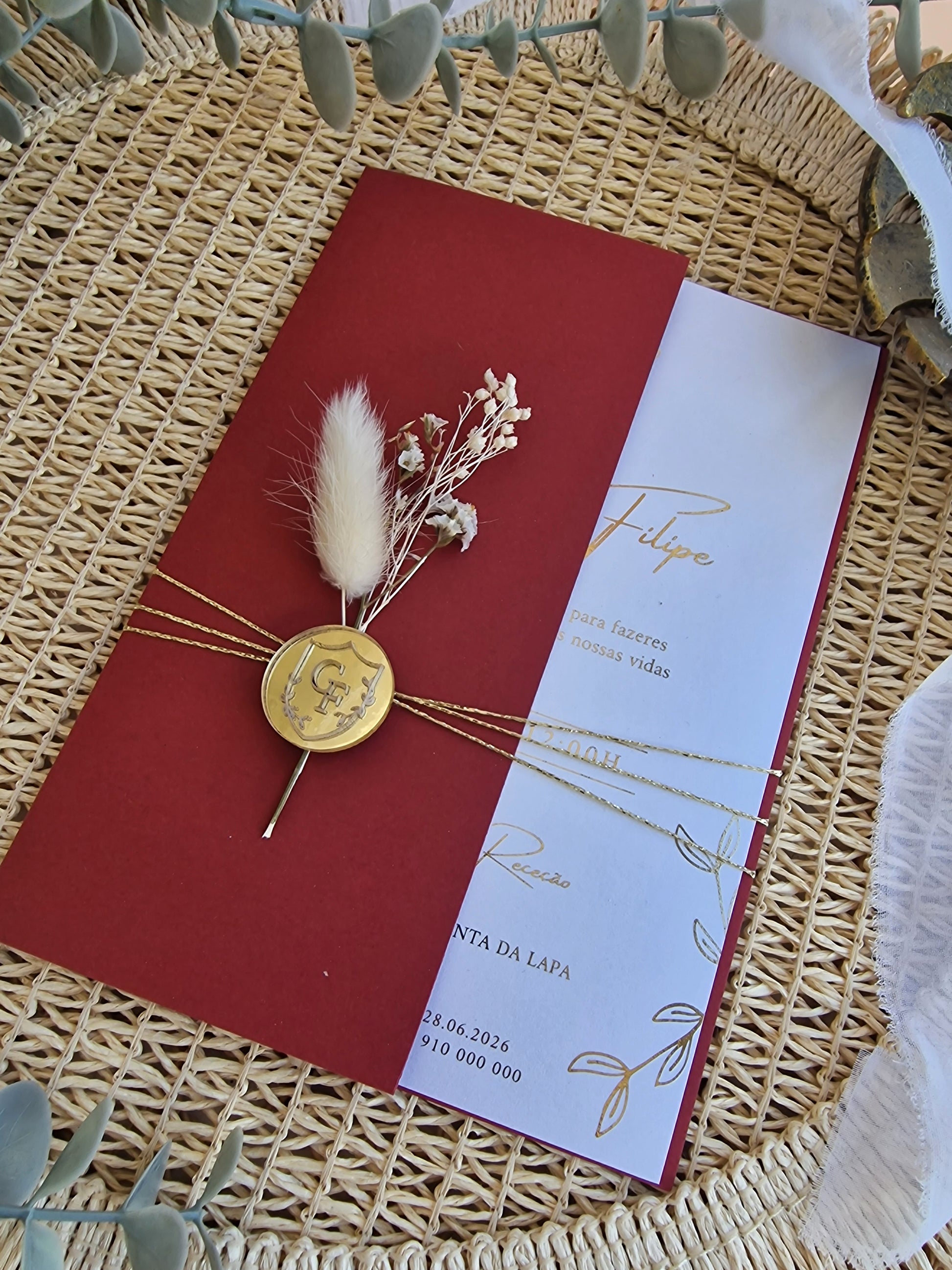 Convite bourdeaux e com fio dourado monograma espelhado, flores secas e foil dourado
