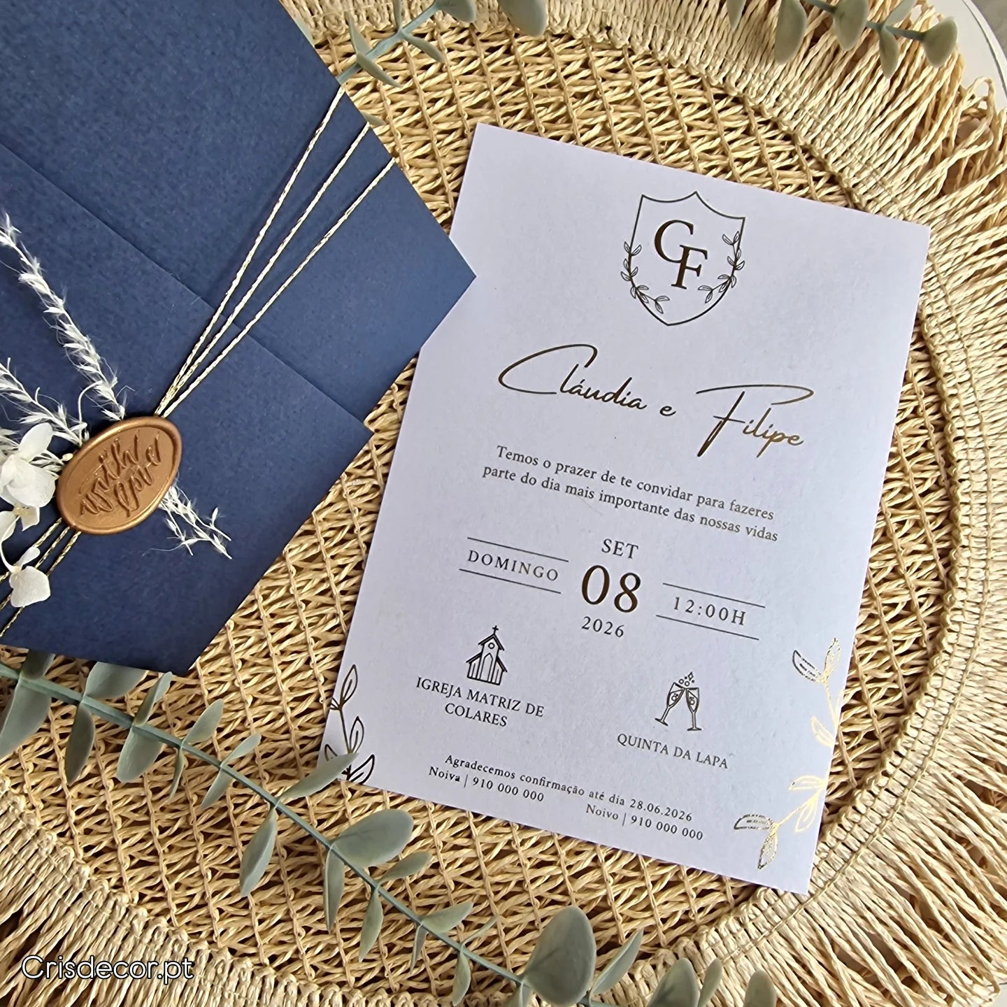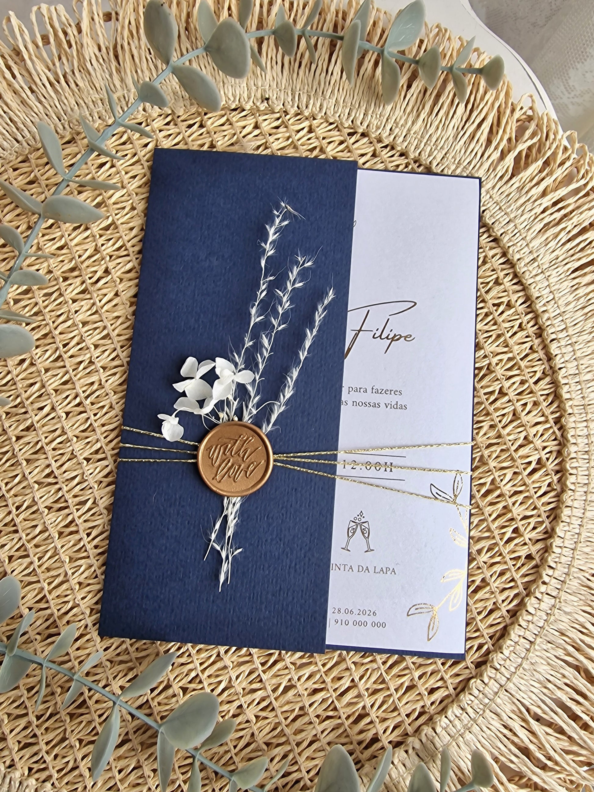 Convite bourdeaux e com fio dourado monograma espelhado, flores secas e foil dourado