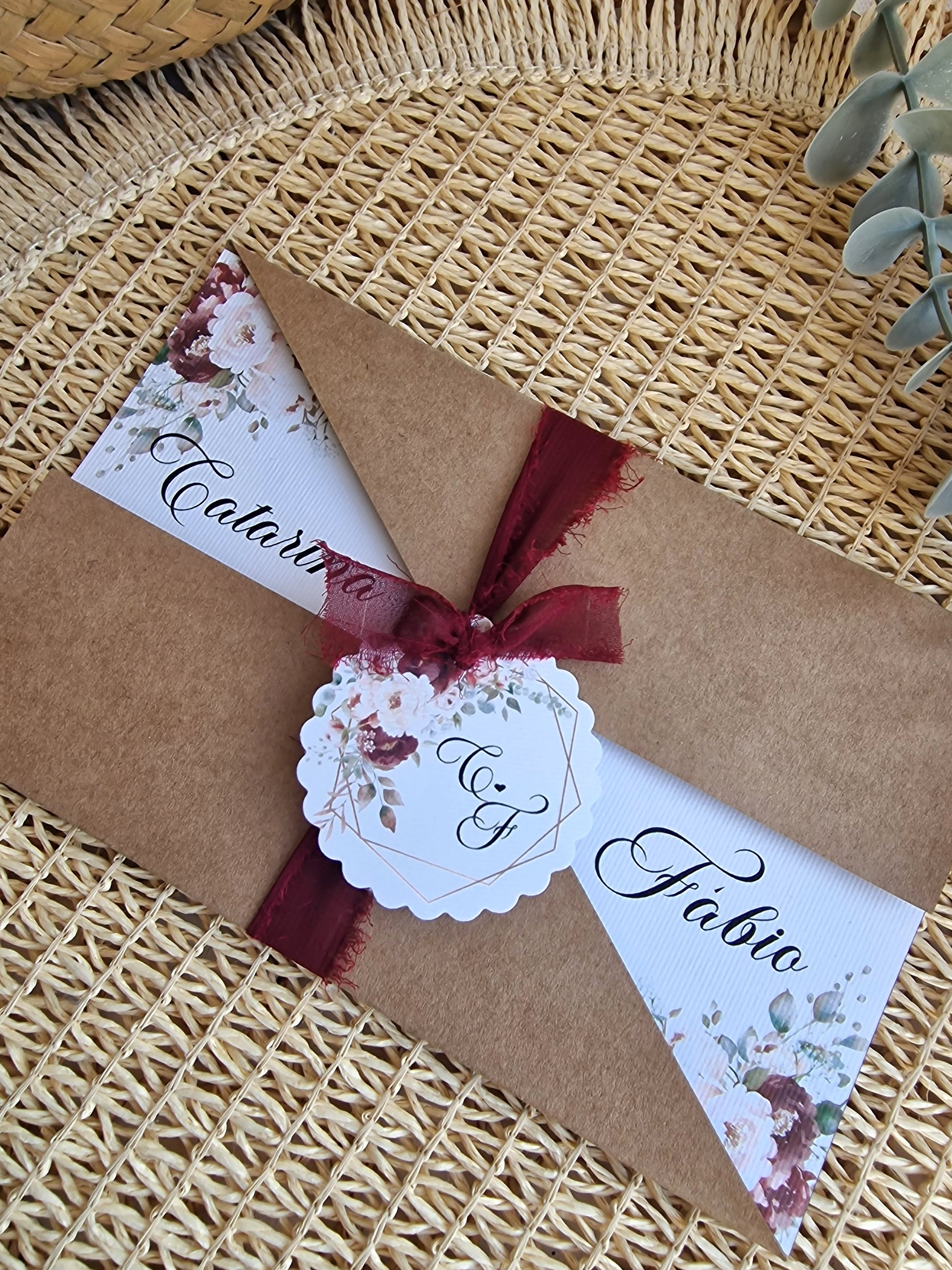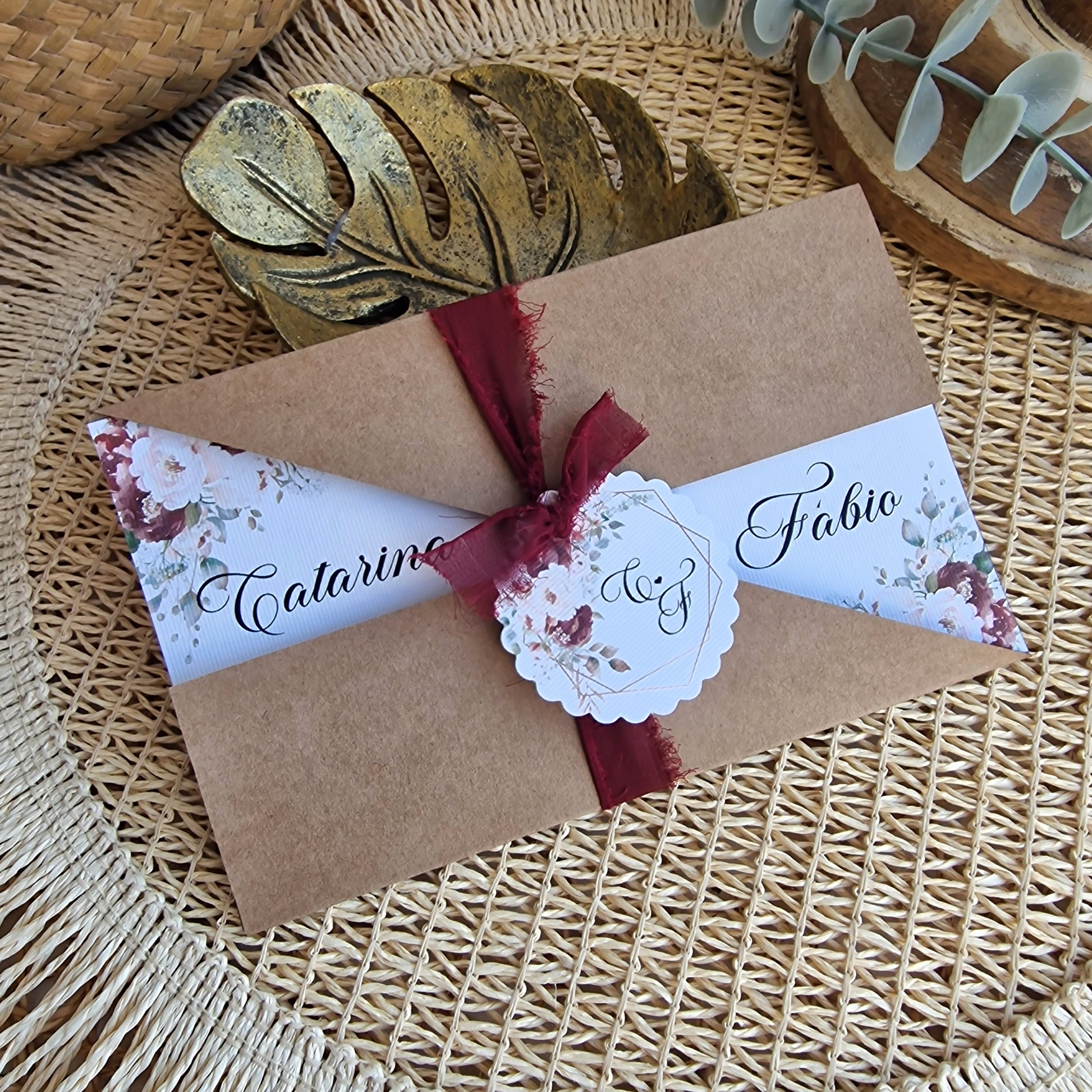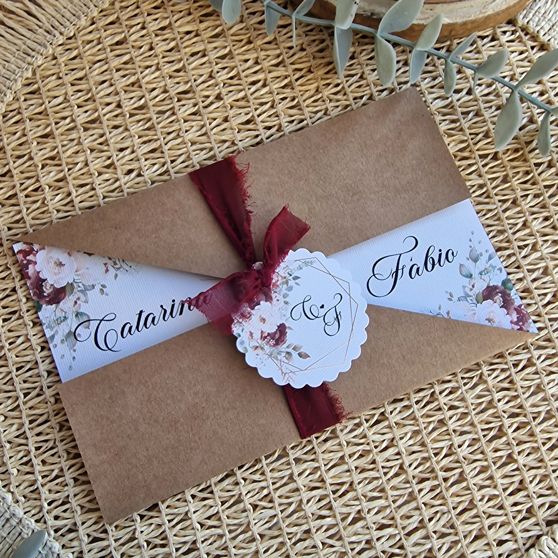 Convite rústicos krafth com fita em tecido e floral bourdeaux