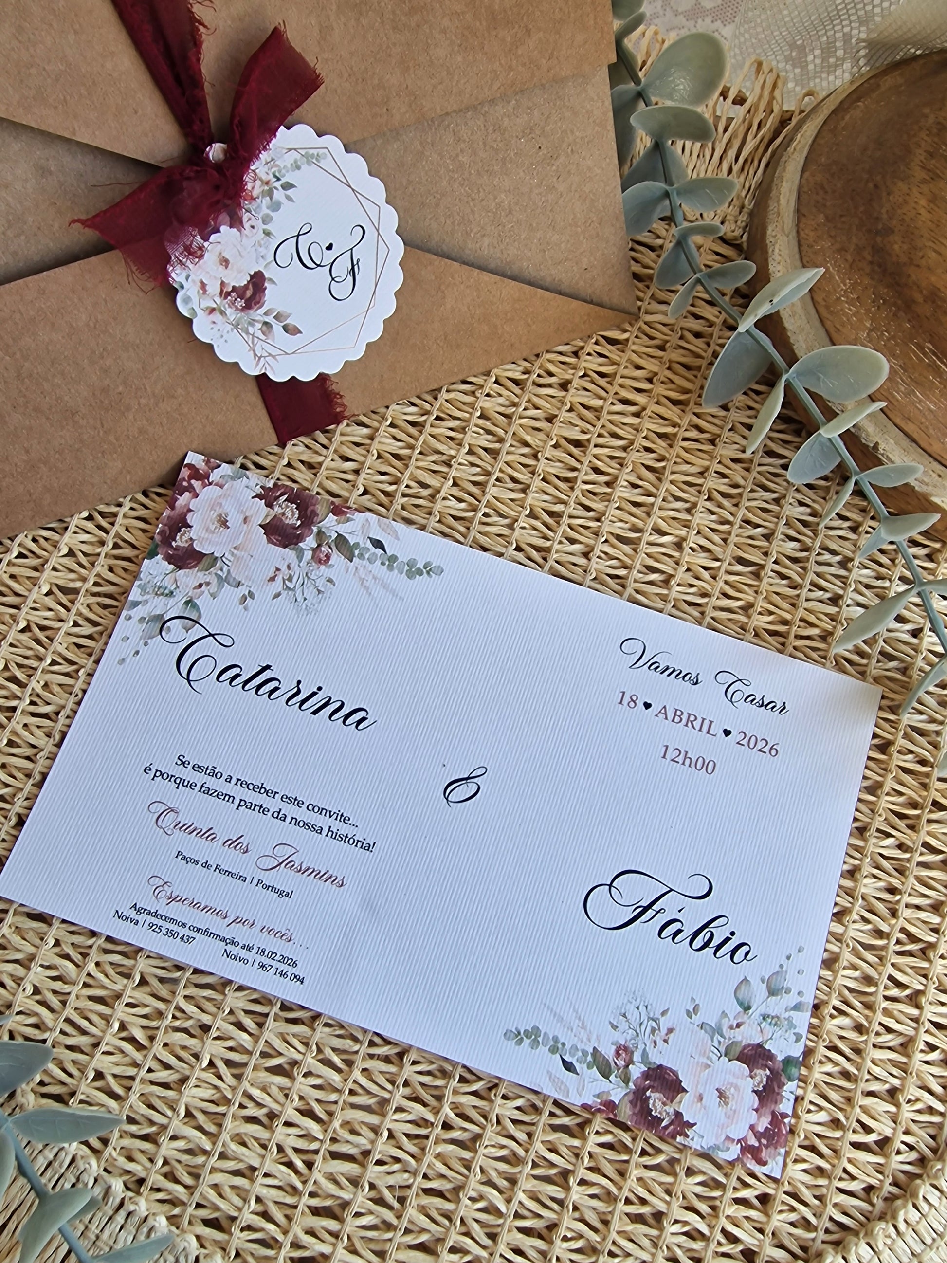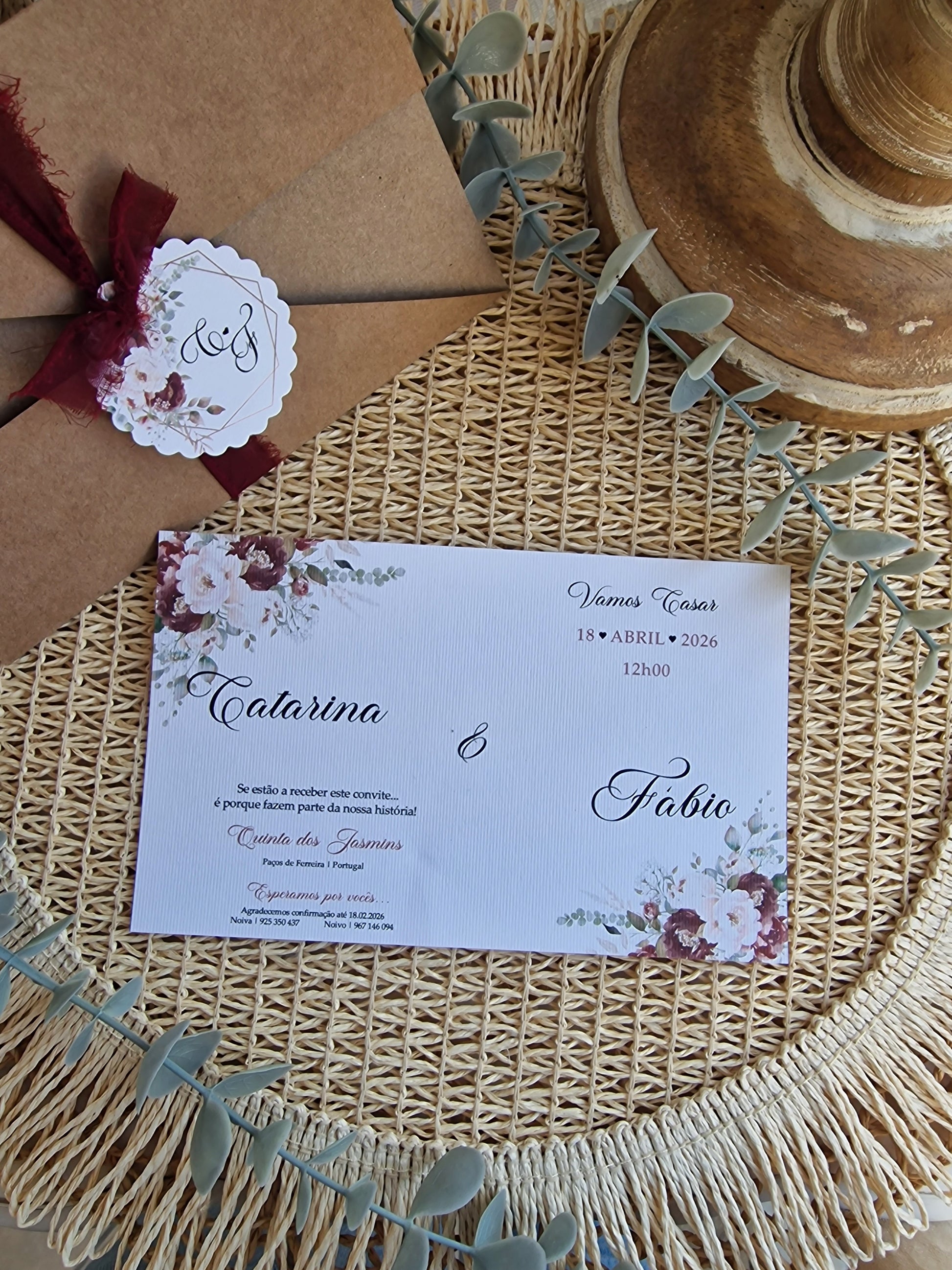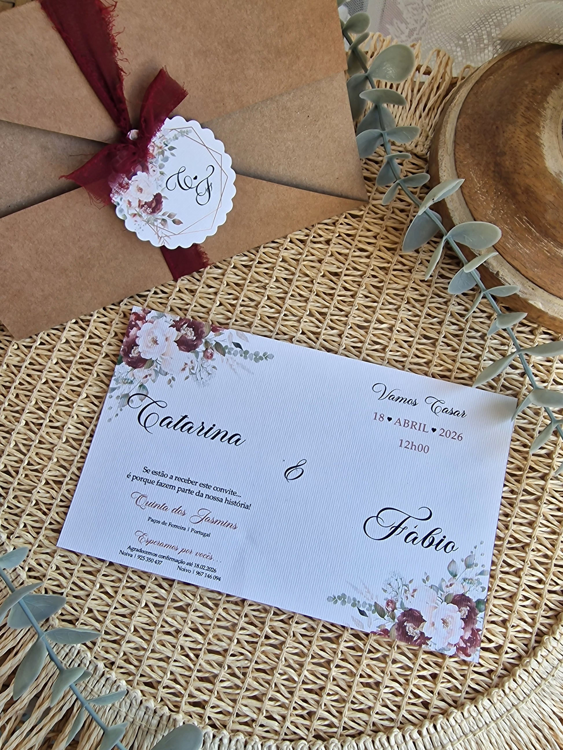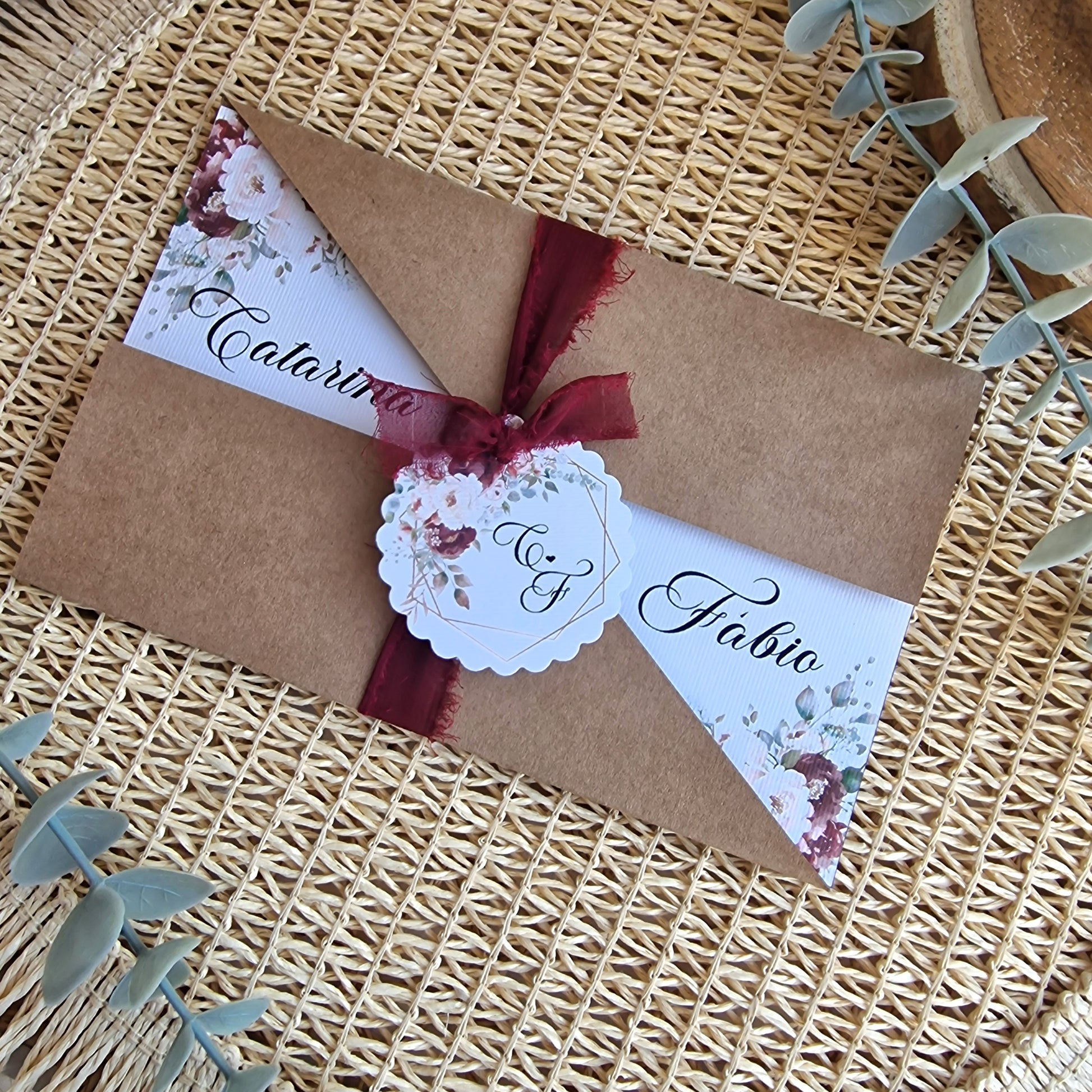 Convite rústicos krafth com fita em tecido e floral bourdeaux