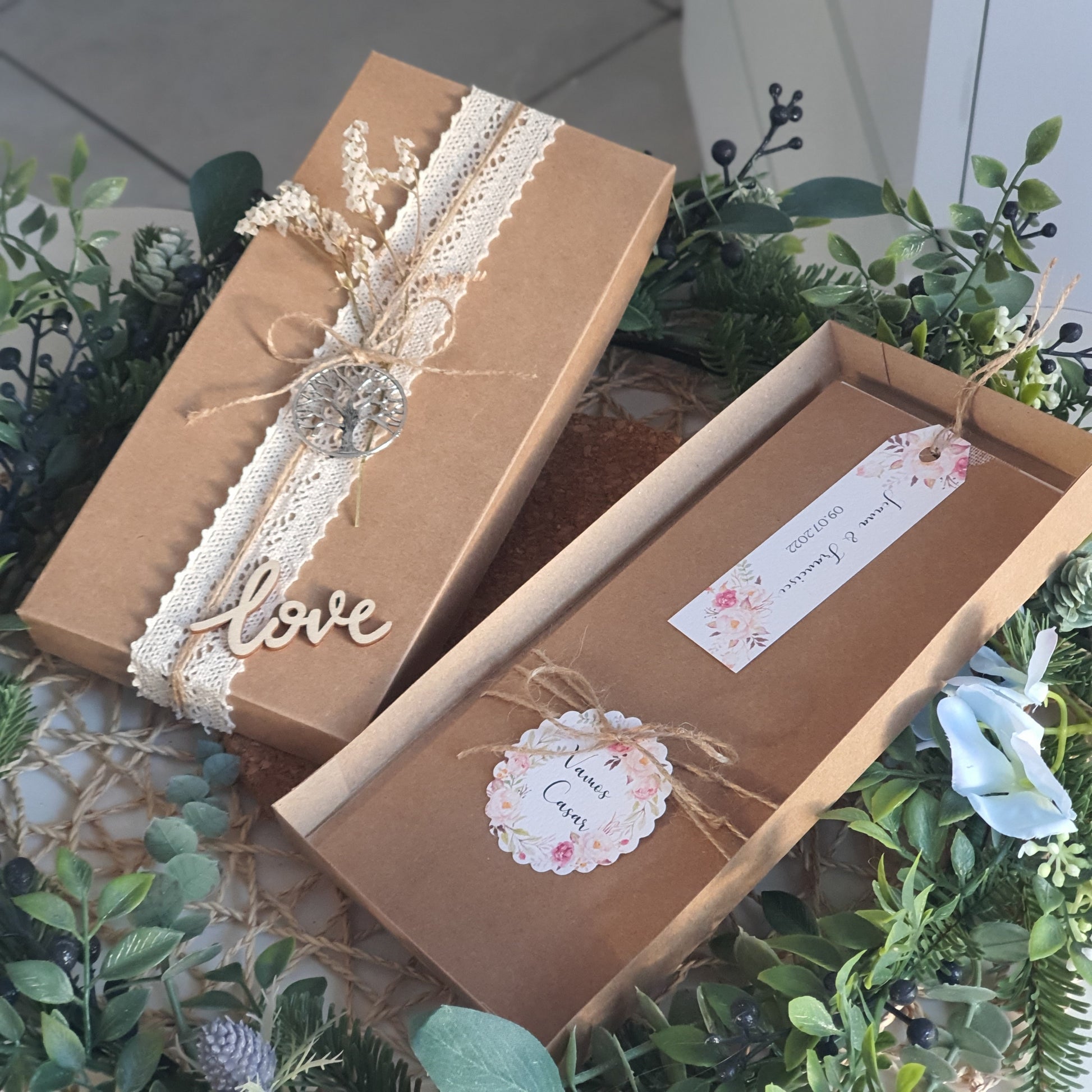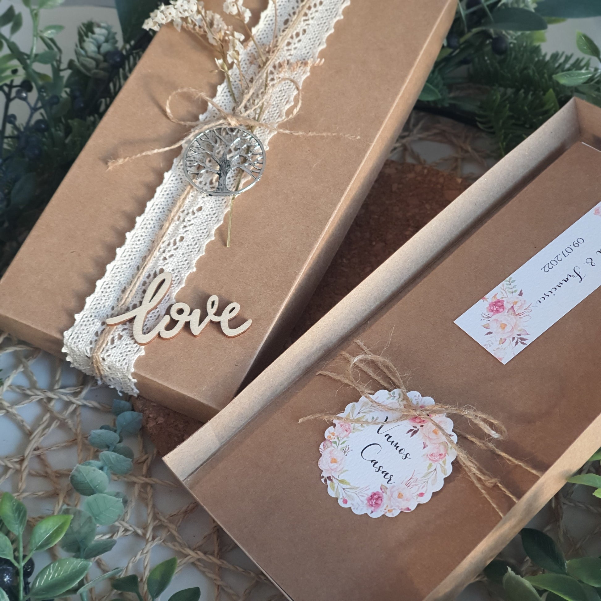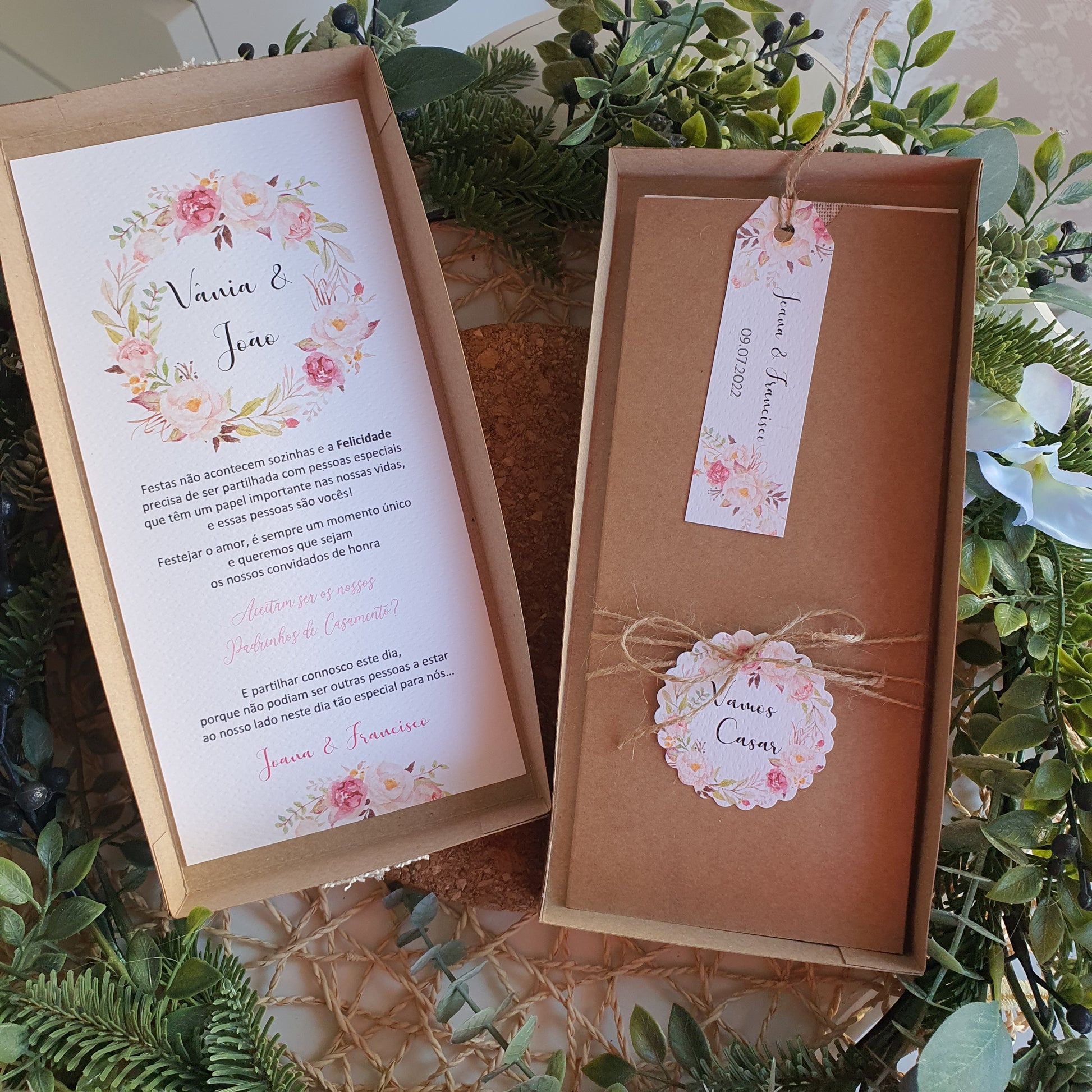 Caixa com convite e dedicatória para padrinhos / pais /avós / irmãos / damas de honra